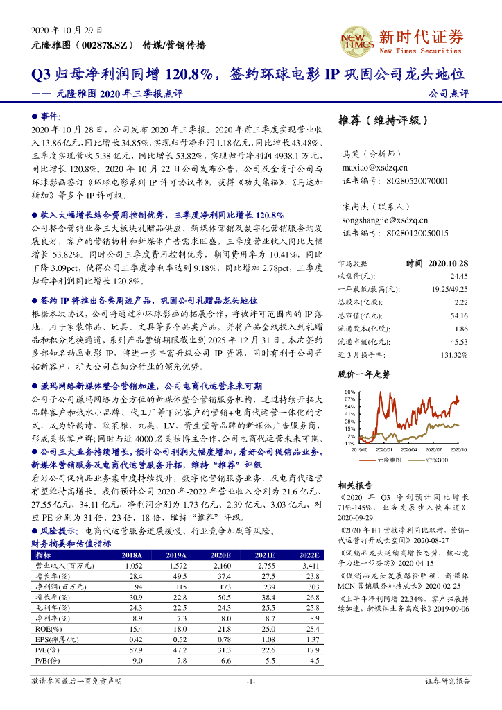 新时代证券:元隆雅图2020年三季报点评:Q3归母净利润同增120.8%,签约环球电影IP巩固公司龙头地位.pdf