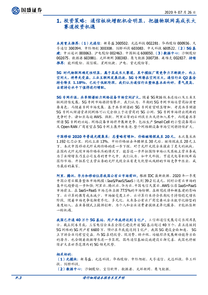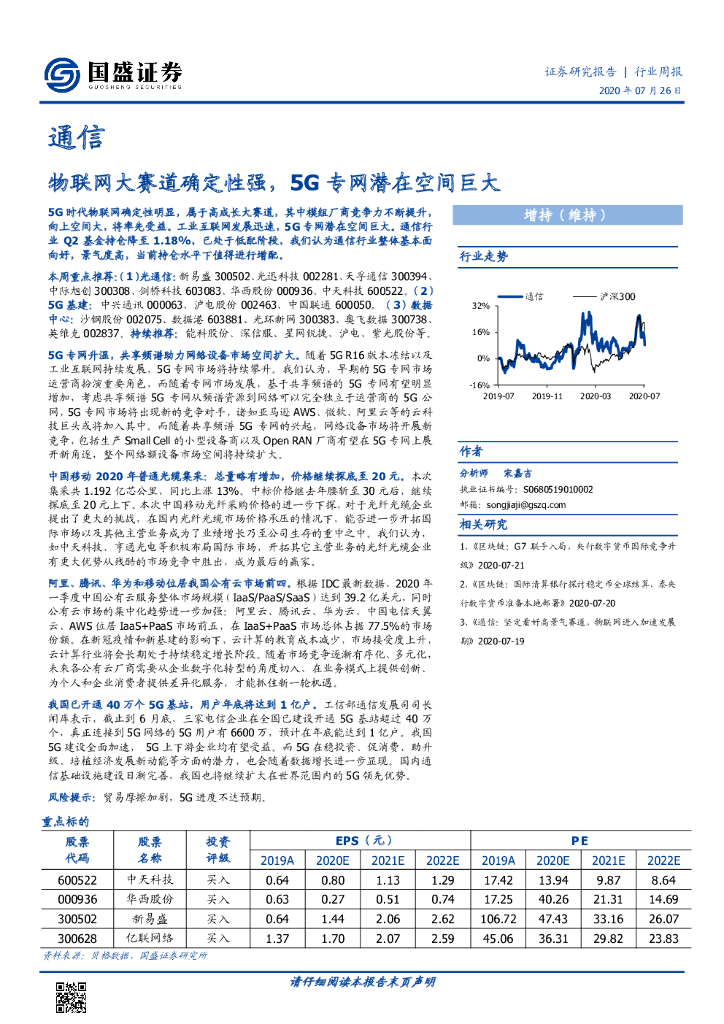 国盛证券:通信行业周报:物联网大赛道确定性强,5G专网潜在空间巨大.pdf