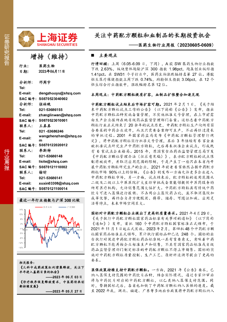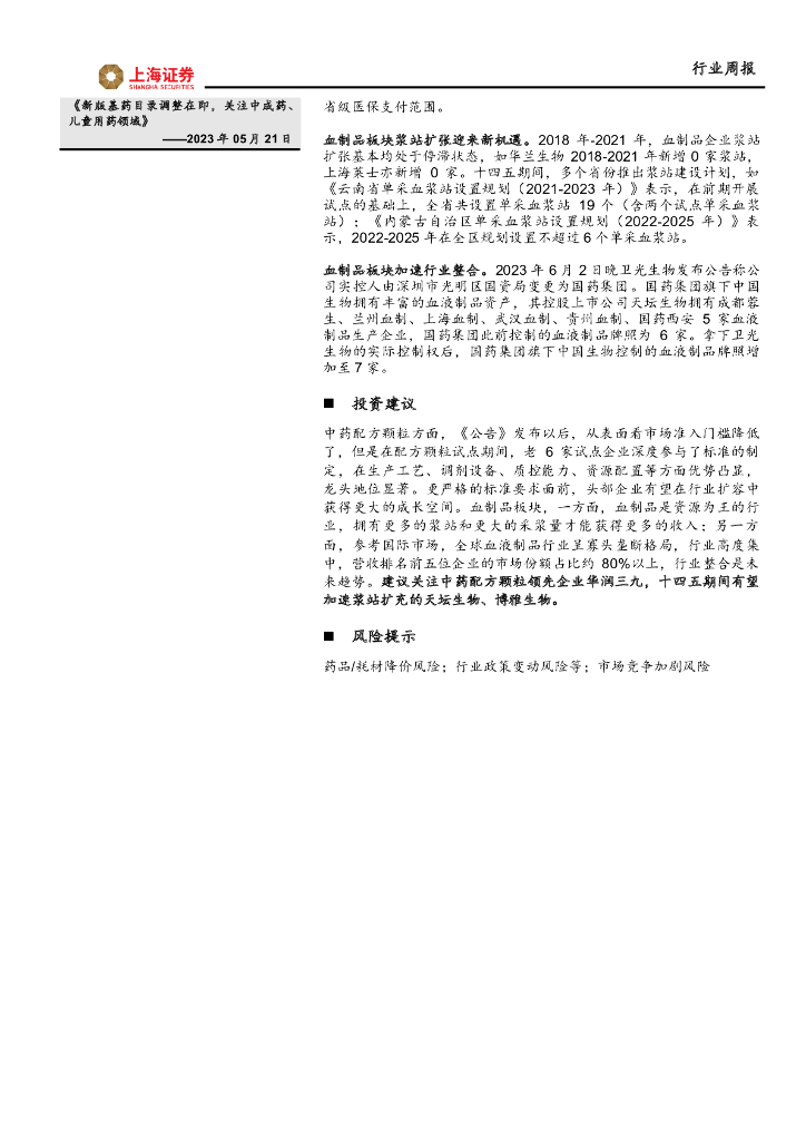 上海证券:医药生物行业周报:关注中药配方颗粒和血制品的长期投资机会.pdf