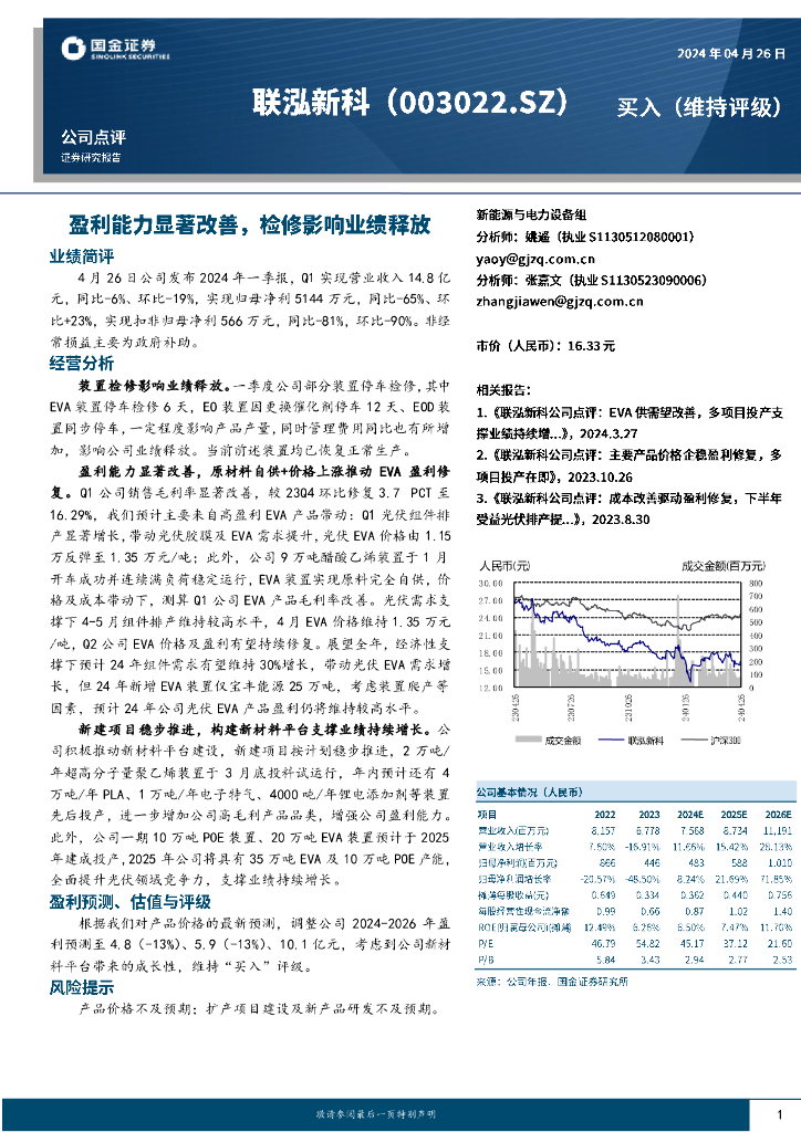国金证券:联泓新科(003022)-盈利能力显著改善,检修影响业绩释放.pdf