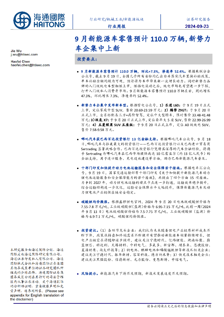 海通国际:新能源板块行业周报:9月新能源车零售预计110.0万辆,新势力车企集中上新.pdf