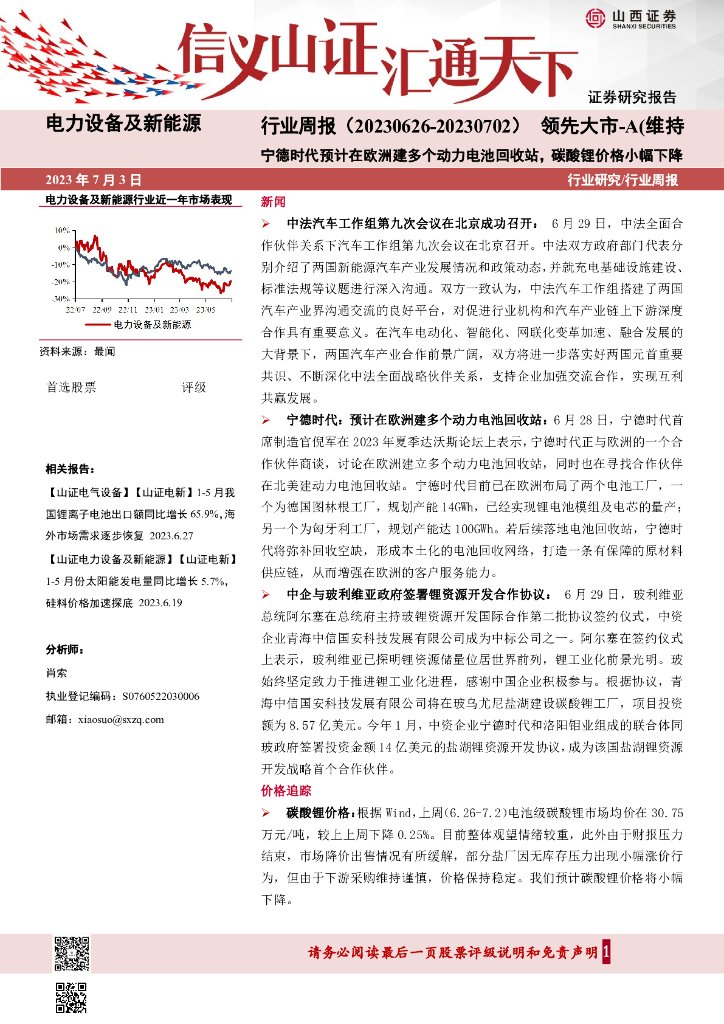 山西证券:电力设备及新能源行业周报:宁德时代预计在欧洲建多个动力电池回收站,碳酸锂价格小幅下降.pdf