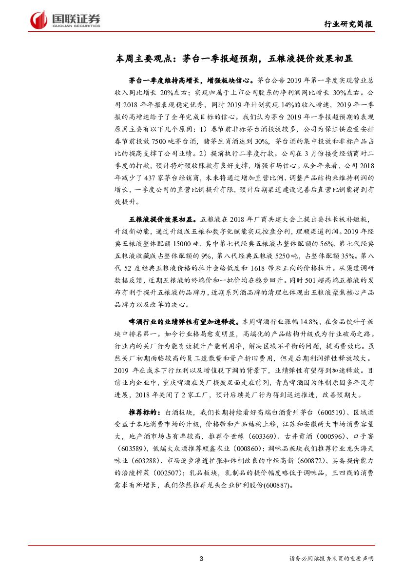 国联证券:食品饮料行业2019年第13期:茅台一季报超预期,五粮液提价效果初显.pdf