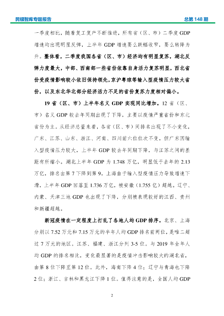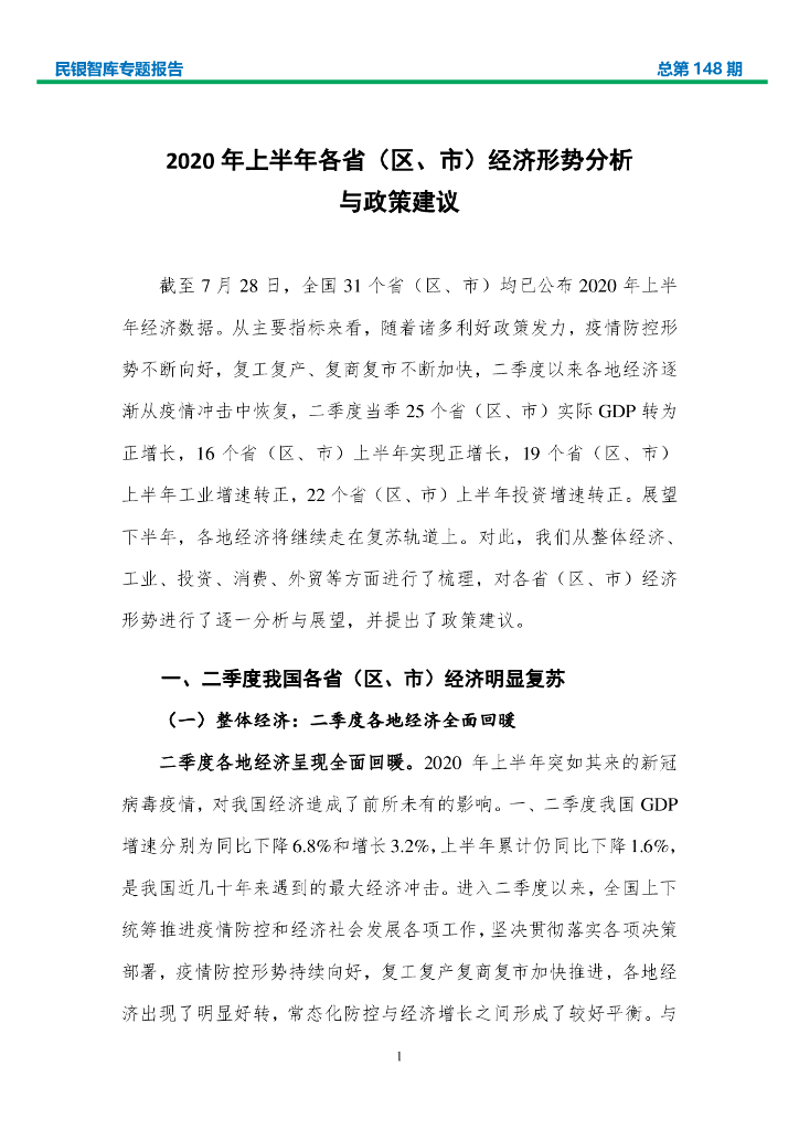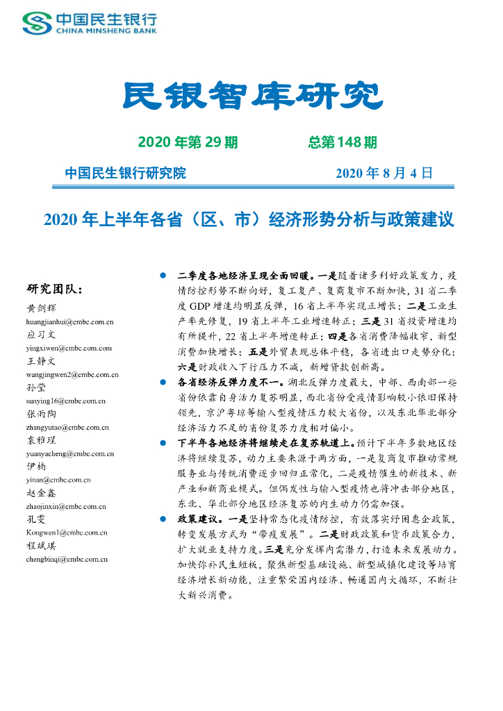 中国民生银行:2020年上半年各省(区、市)经济形势分析与政策建议.pdf