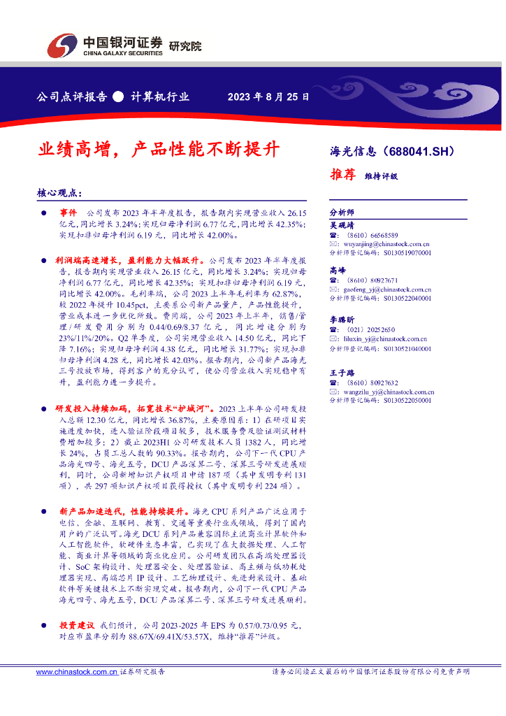 中国银河:海光信息(688041)-业绩高增,产品性能不断提升.pdf