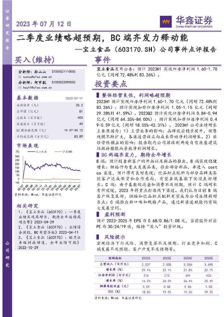 华鑫证券:宝立食品(603170)-公司事件点评报告:二季度业绩略超预期,BC端齐发力释动能.pdf