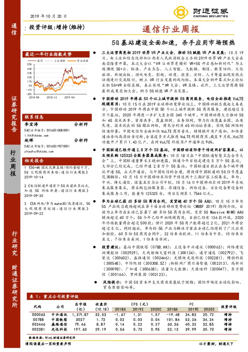 财通证券:通信行业周报:5G基站建设全面加速,杀手应用市场预热.pdf