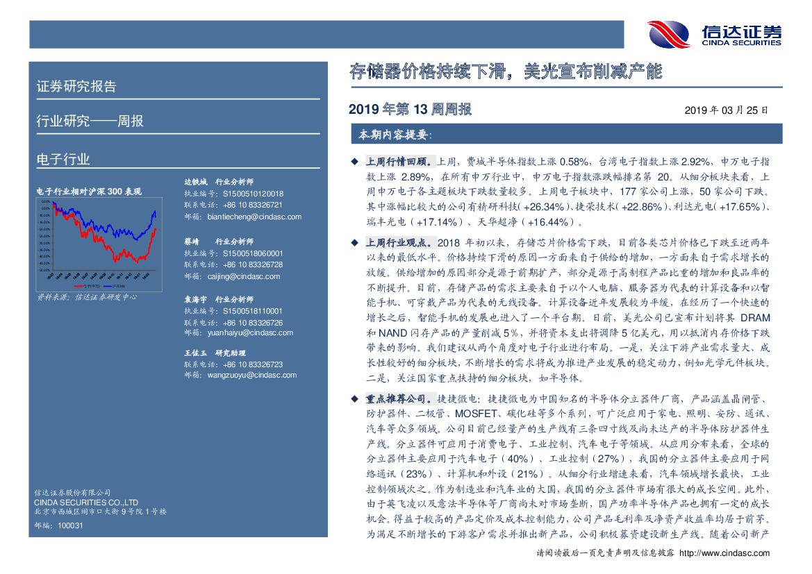 信达证券:电子行业2019年第13周周报:存储器价格持续下滑,美光宣布削减产能.pdf