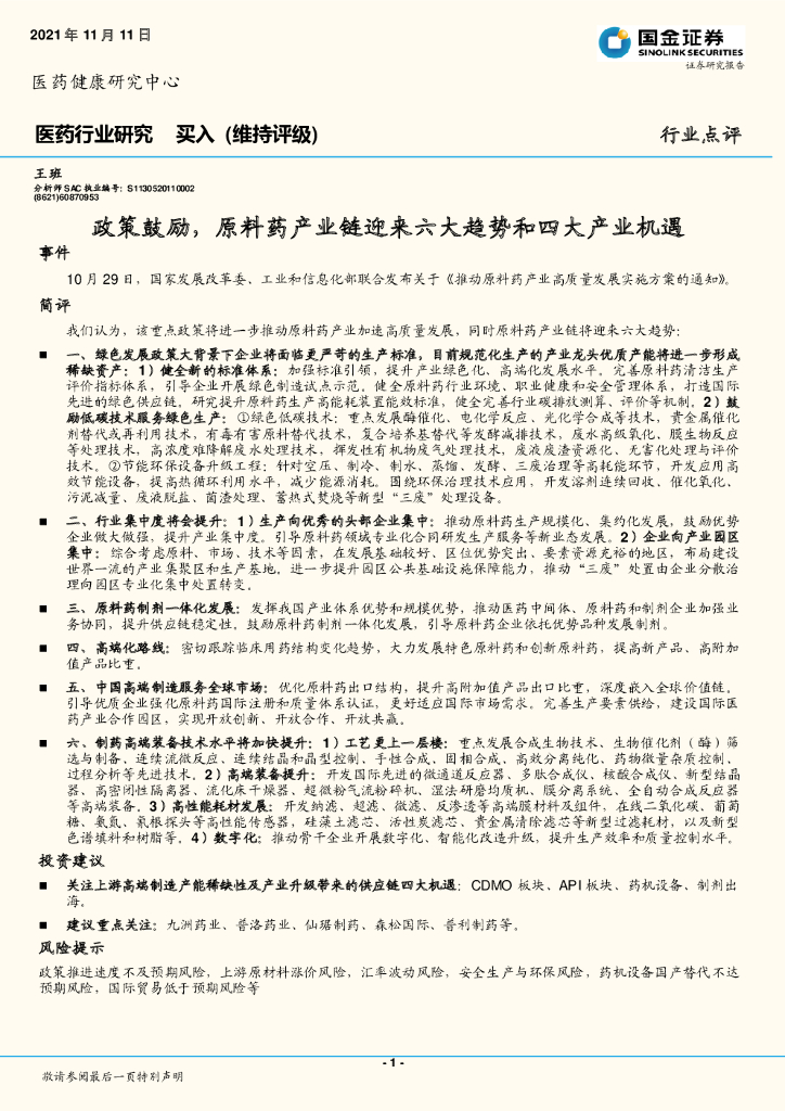 国金证券:医药健康行业点评:政策鼓励,原料药产业链迎来六大趋势和四大产业机遇.pdf