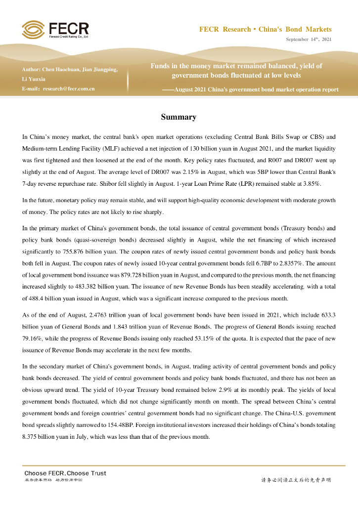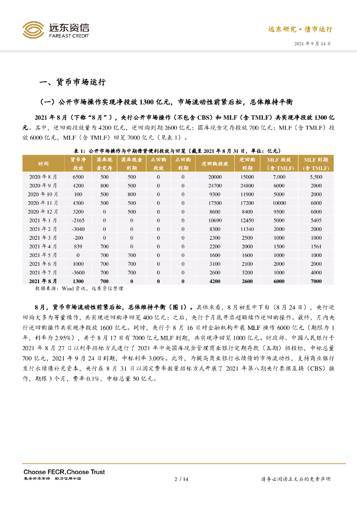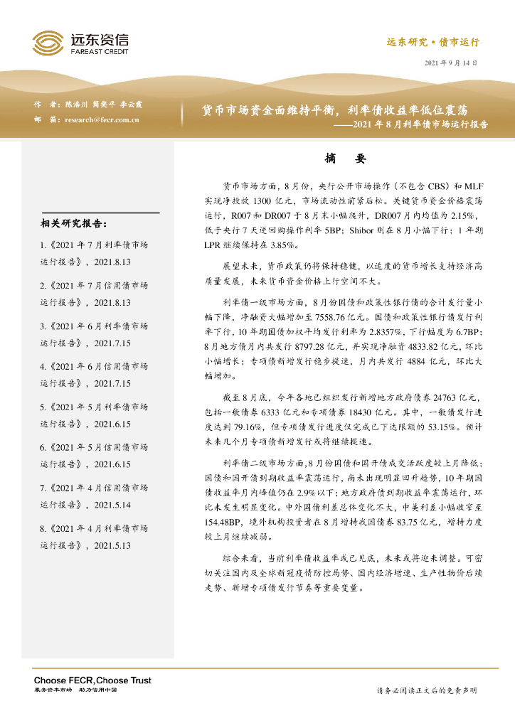 远东资信:2021年8月利率债市场运行报告:货币市场资金面维持平衡,利率债收益率低位震荡.pdf