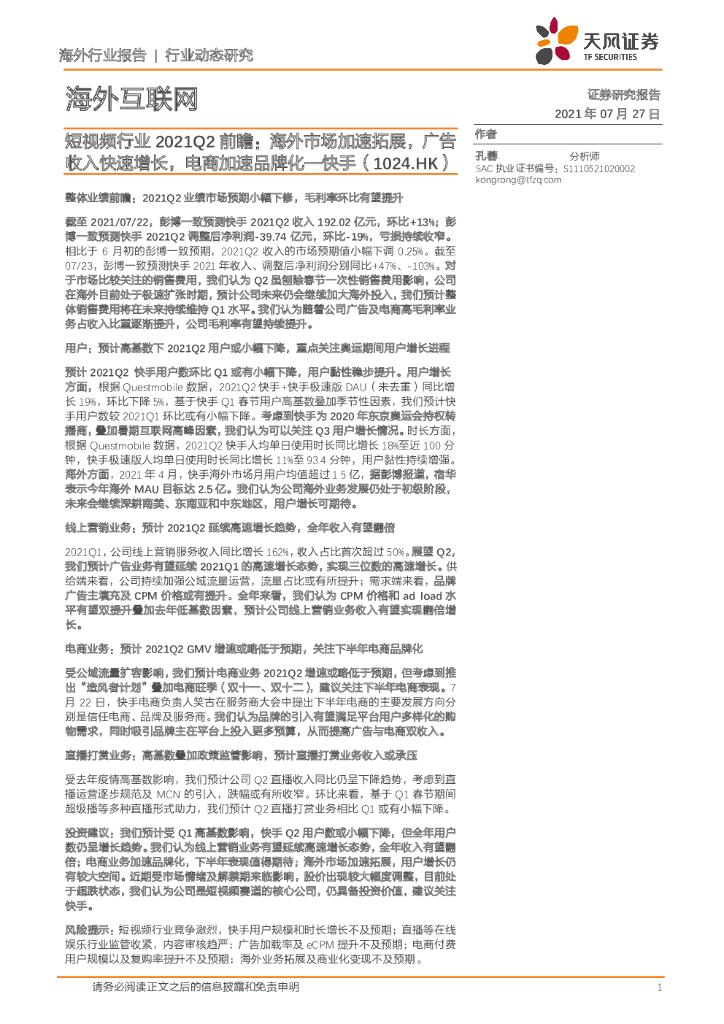 天风证券:短视频行业2021Q2前瞻:海外市场加速拓展,广告收入快速增长,电商加速品牌化—快手.pdf