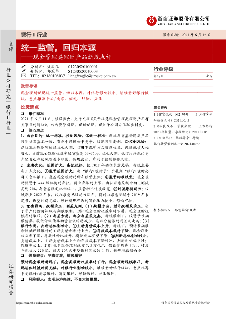 浙商证券:现金管理类理财产品新规点评:统一监管,回归本源.pdf