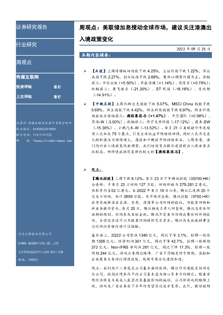 信达证券:传媒互联网及海外周观点:美联储加息搅动全球市场,建议关注港澳出入境政策变化.pdf