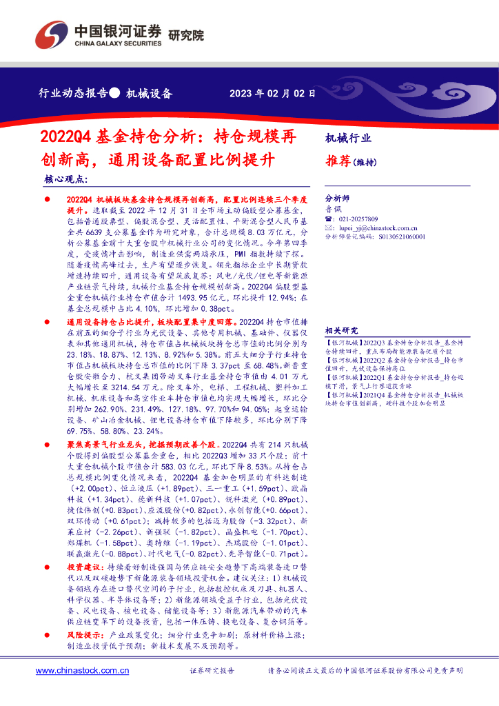 中国银河:机械设备行业2022Q4基金持仓分析:持仓规模再创新高,通用设备配置比例提升.pdf