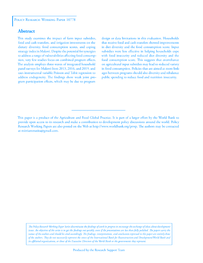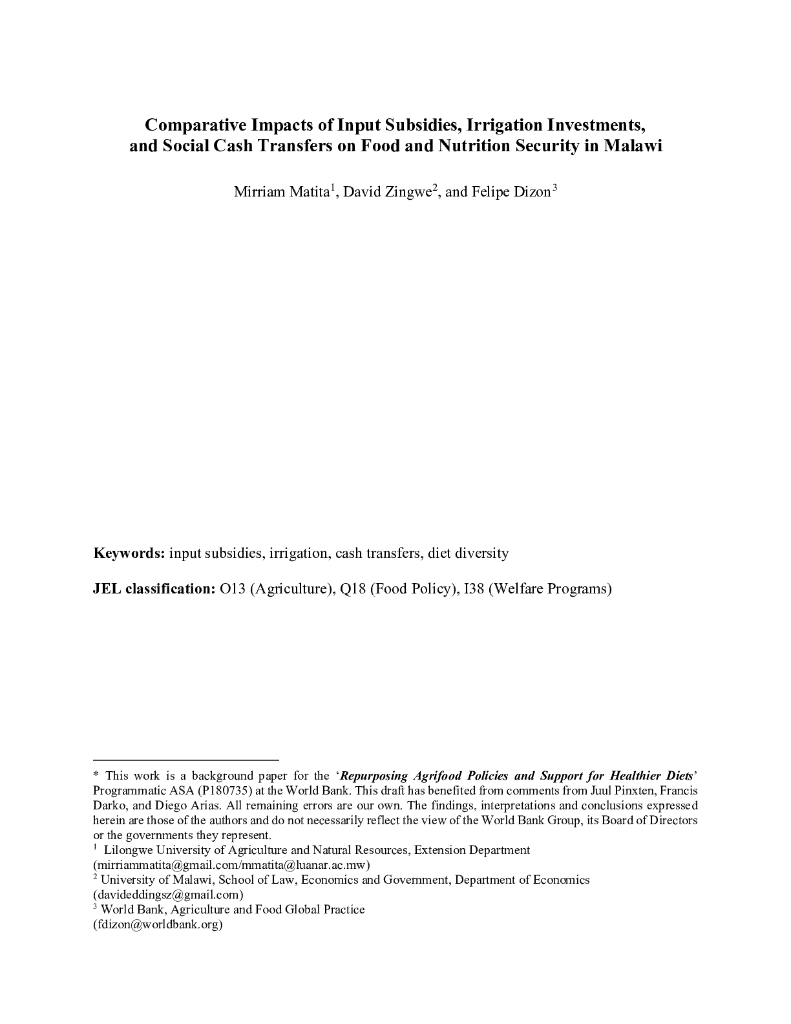 世界银行:投入补贴、灌溉投资和社会现金转移对马拉维粮食和营养安全的比较影响(英文版).pdf