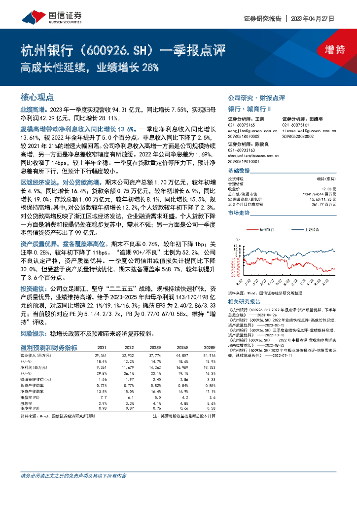 国信证券:杭州银行(600926)-一季报点评:高成长性延续,业绩增长28%.pdf