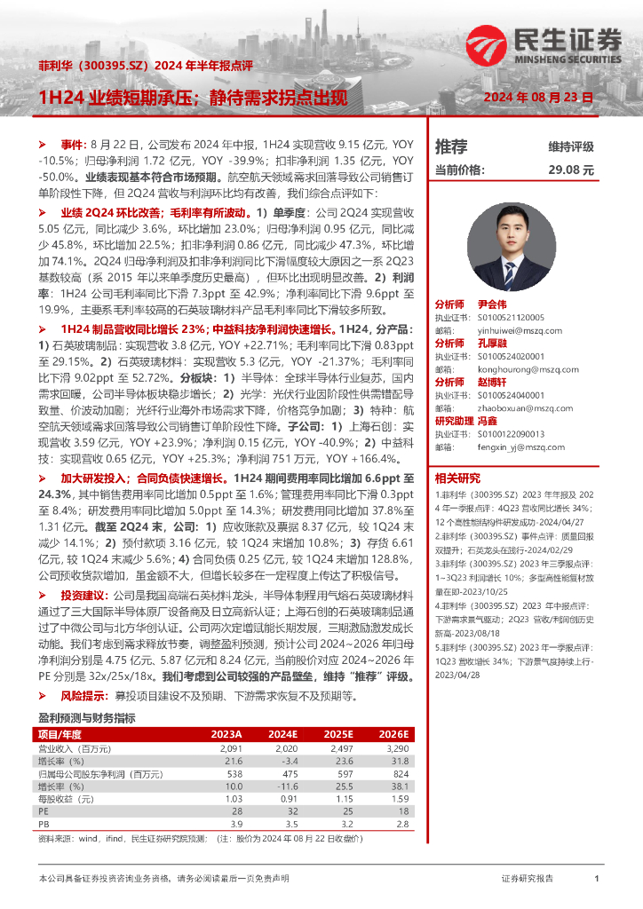 民生证券:菲利华(300395)-2024年半年报点评:1H24业绩短期承压;静待需求拐点出现.pdf