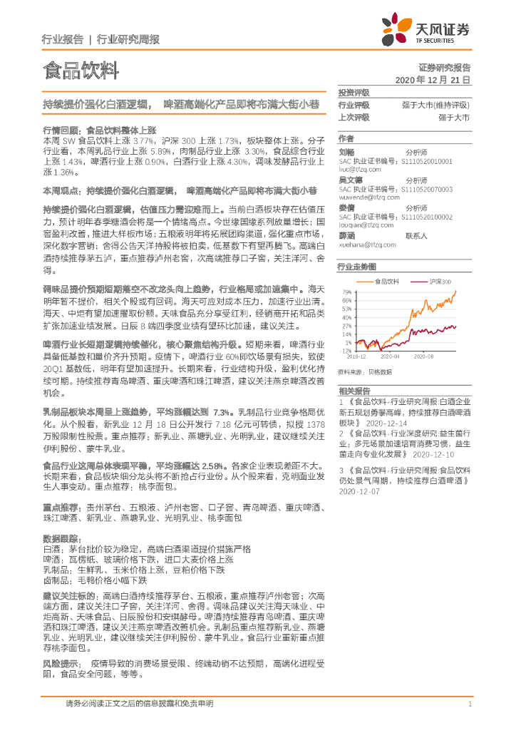 天风证券:食品饮料行业研究周报:持续提价强化白酒逻辑,啤酒高端化产品即将布满大街小巷.pdf