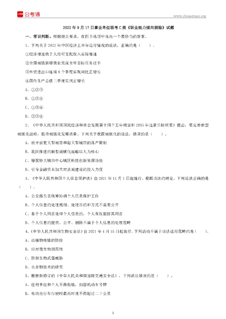2022年9月17日事业单位联考C类《职业能力倾向测验》试题.pdf