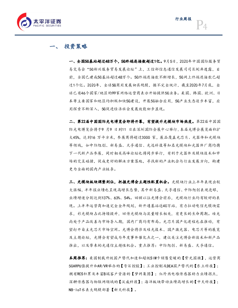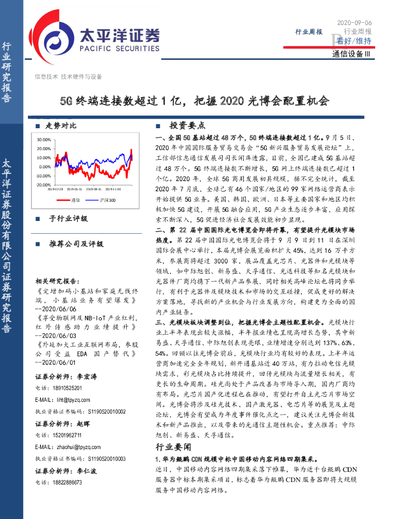 太平洋证券:通信设备Ⅲ行业周报:5G终端连接数超过1亿,把握2020光博会配置机会.pdf