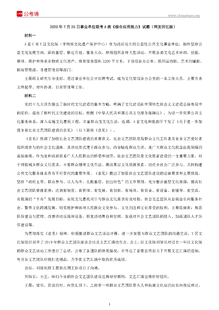2020年7月25日事业单位联考A类《综合应用能力》试题.pdf