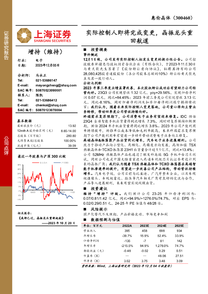 上海证券:惠伦晶体(300460)-实际控制人即将完成变更,晶振龙头重回航道.pdf
