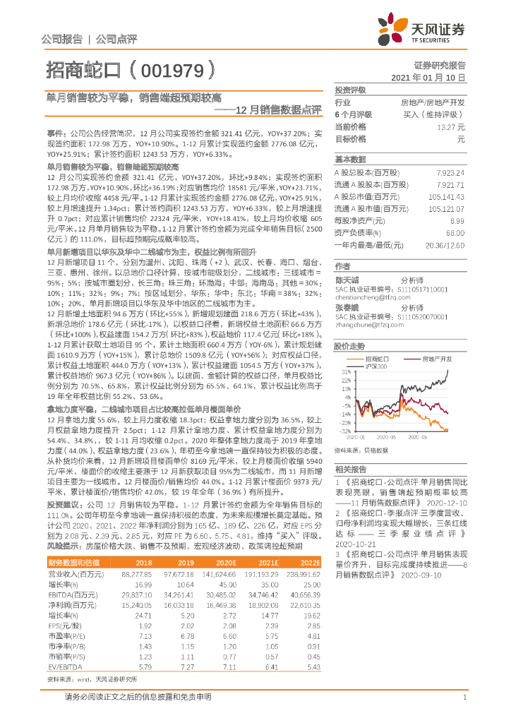 天风证券:招商蛇口(001979)-12月销售数据点评:单月销售较为平稳,销售端超预期较高.pdf