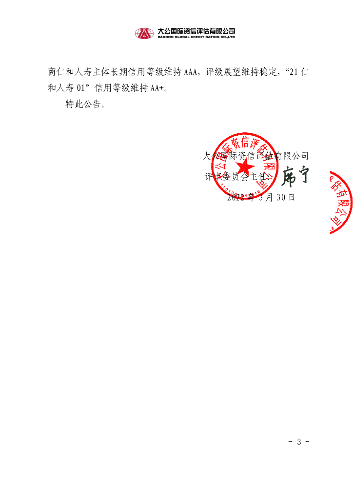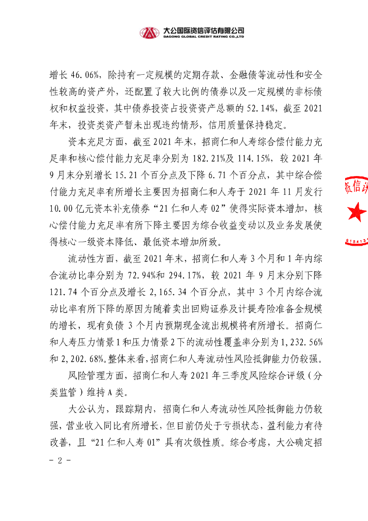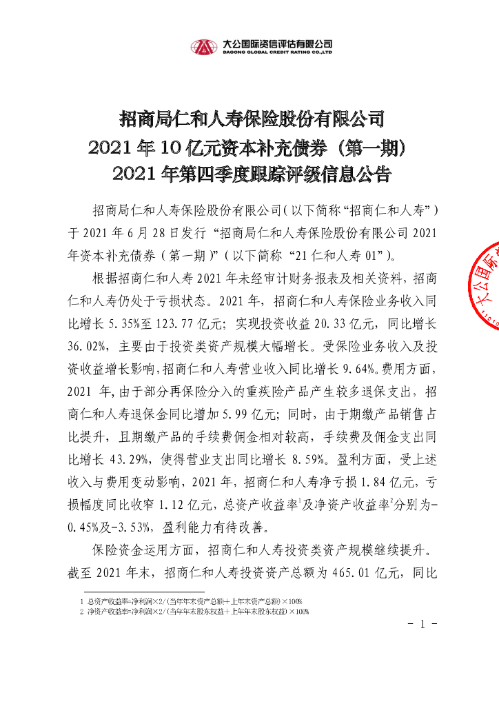 大公:招商局仁和人寿保险股份有限公司2021年10亿元资本补充债券(第一期)2021年第四季度跟踪评级信息公告.pdf