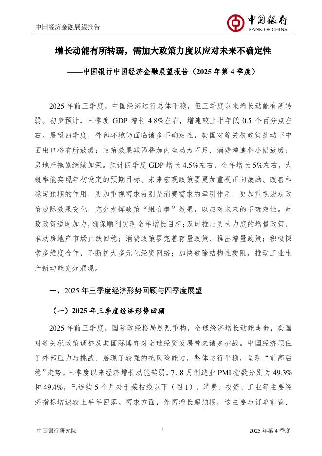 中国银行研究院:中国银行中国经济金融展望报告(2025年第4季度):增长动能有所转弱,需加大政策力度以应对未来不确定性.pdf