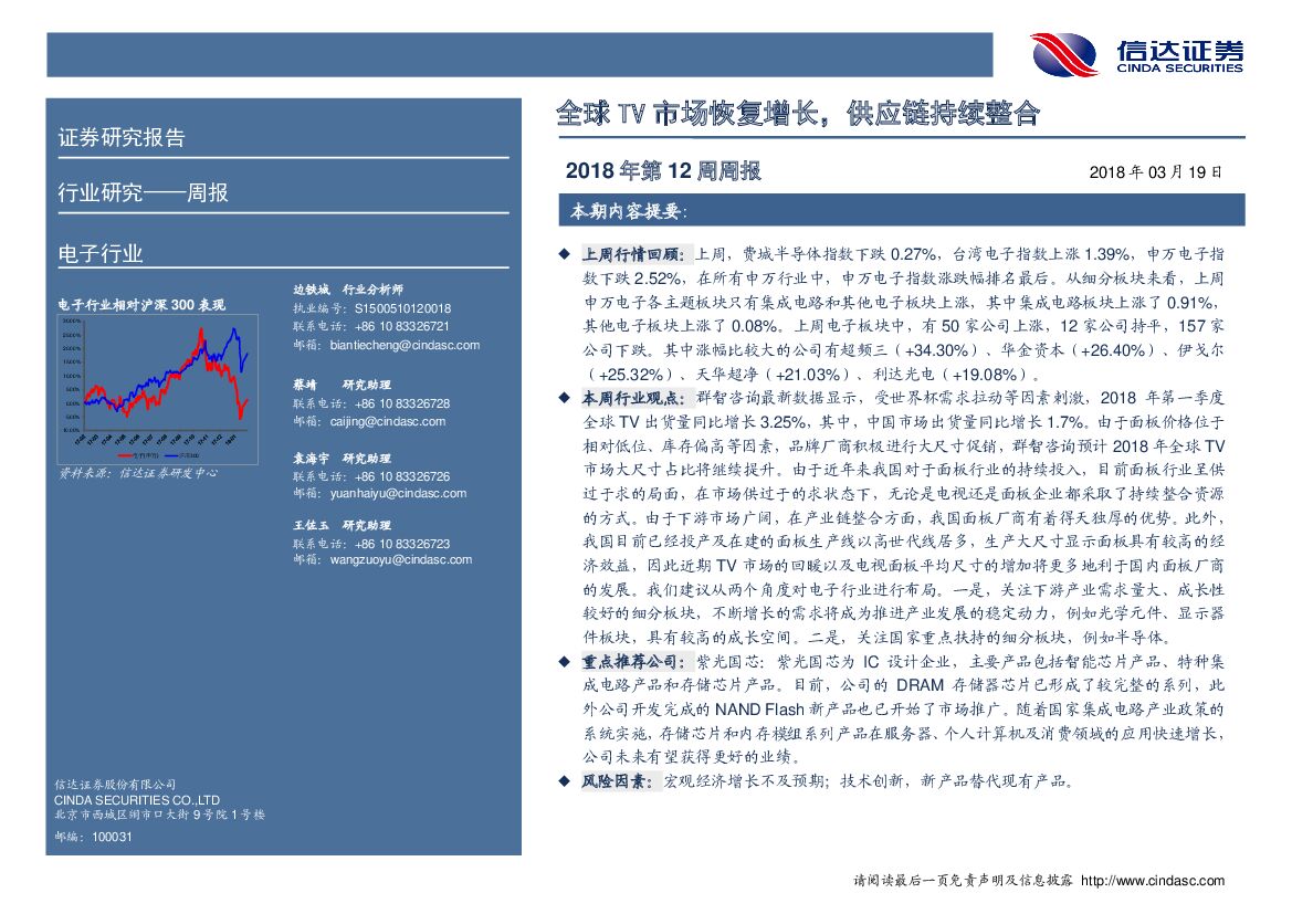 信达证券:电子行业2018年第12周周报:全球TV市场恢复增长,供应链持续整合.pdf