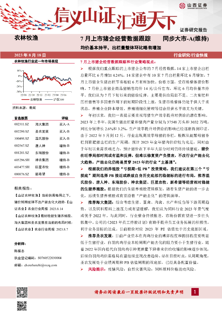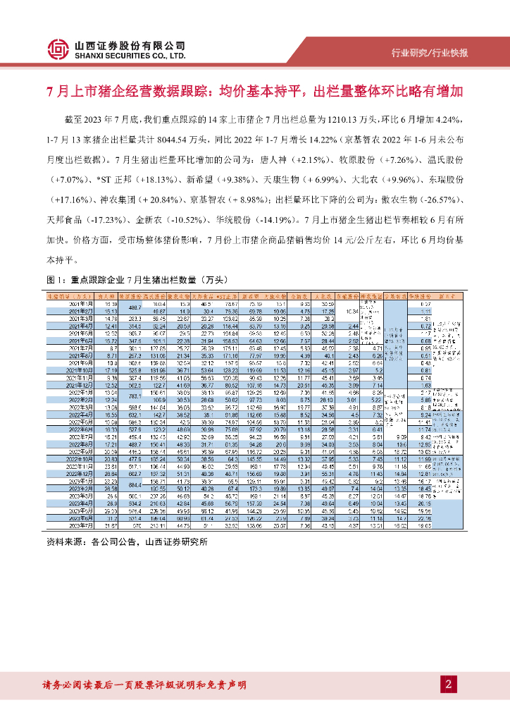山西证券:农林牧渔行业快报:7月上市猪企经营数据跟踪均价基本持平,出栏量整体环比略有增加.pdf