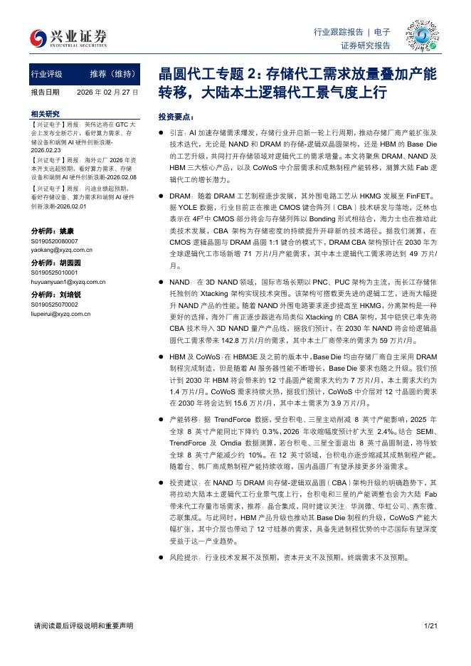 兴业证券:晶圆代工专题2:存储代工需求放量叠加产能转移,大陆本土逻辑代工景气度上行.pdf