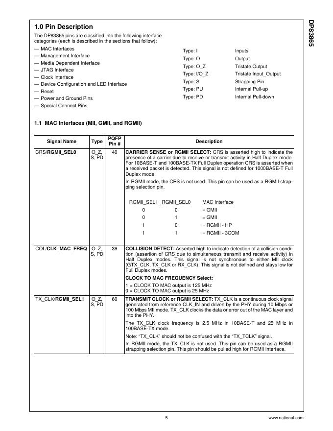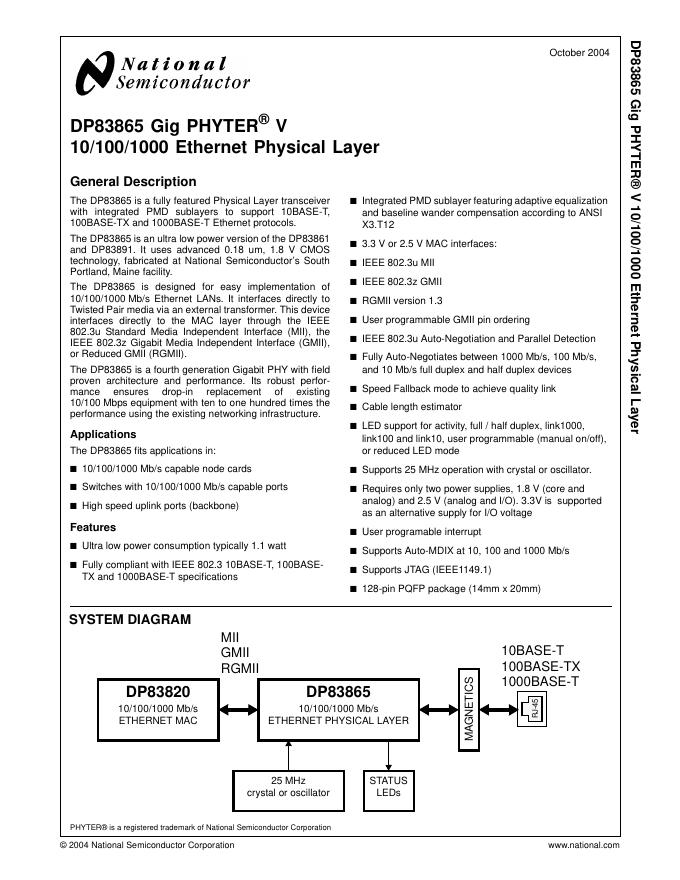 National Semiconductor DP83865 Gig PHYTER® V 10/100/1000 Ethernet Physical Layer 数据手册.pdf