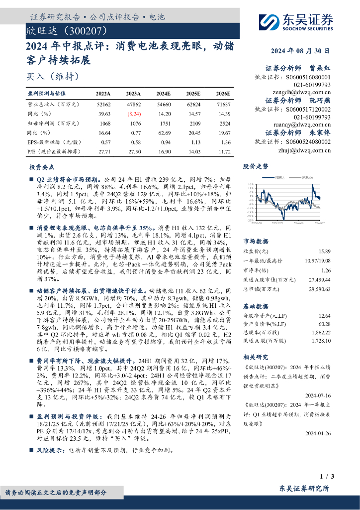 东吴证券:欣旺达(300207)-2024年中报点评:消费电池表现亮眼,动储客户持续拓展.pdf
