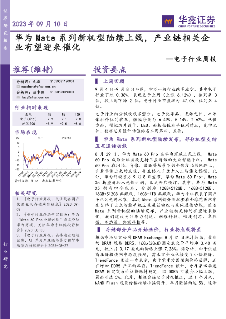 华鑫证券:电子行业周报:华为Mate系列新机型陆续上线,产业链相关企业有望迎来催化.pdf