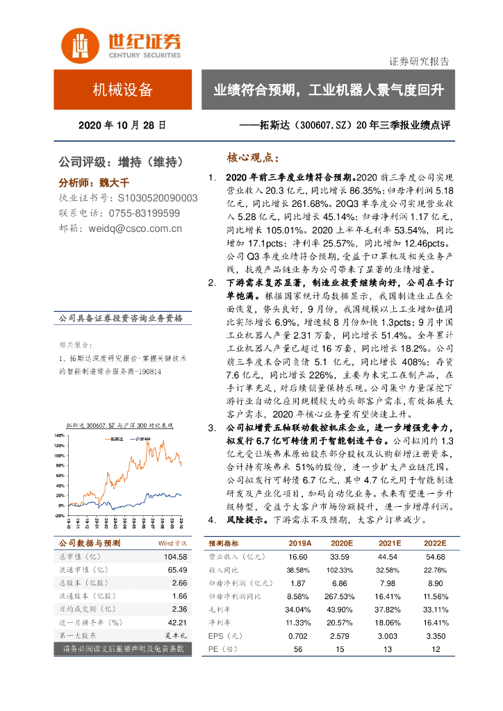 世纪证券:拓斯达(300607)-20年三季报业绩点评:业绩符合预期,工业机器人景气度回升.pdf