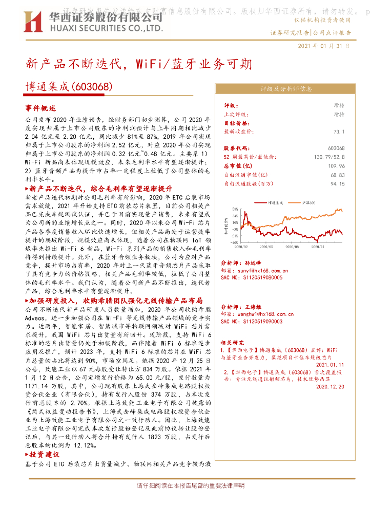 华西证券:博通集成(603068)-新产品不断迭代,WiFi/蓝牙业务可期.pdf