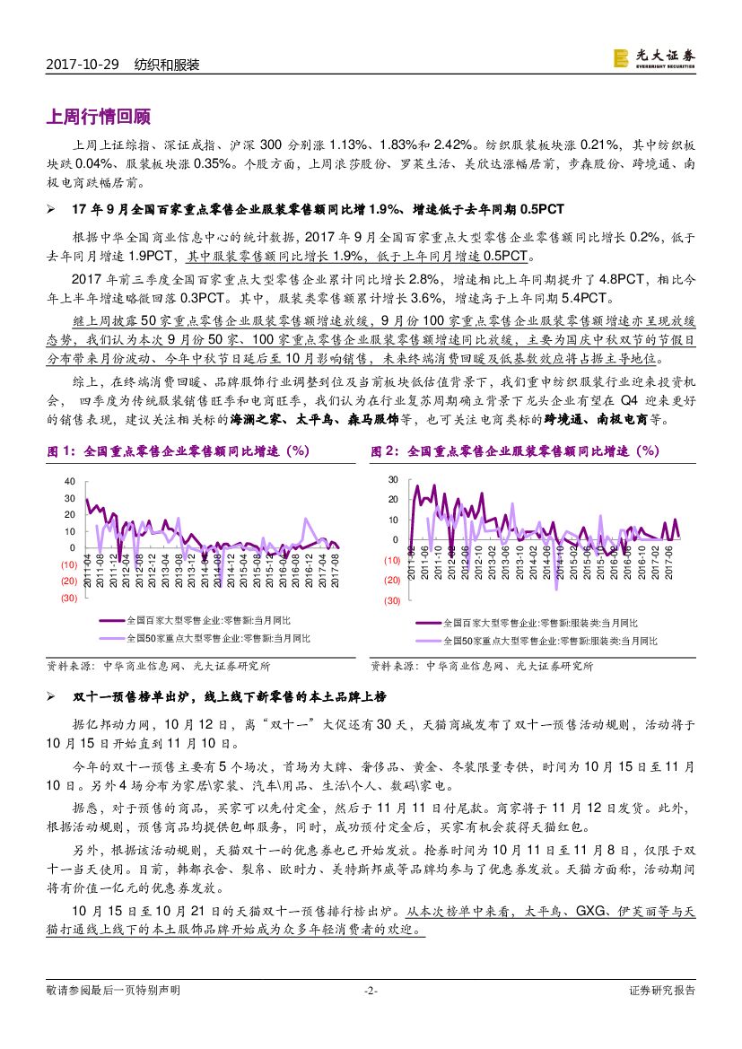 光大证券:纺织和服装行业周报:9月百家重点企业服装零售额略放缓,双十一预售榜单出炉.pdf