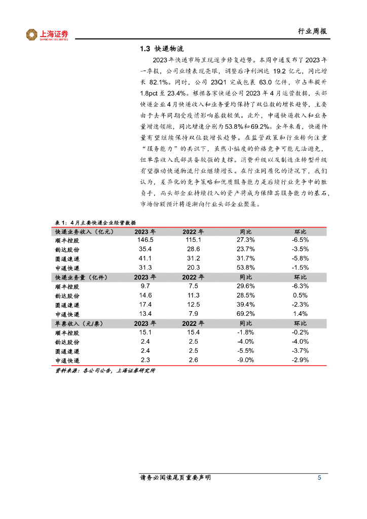 上海证券:交通运输行业周报:申通4月业务量/收入同比增速领跑,看好港口铁路公路板块的向上动能.pdf