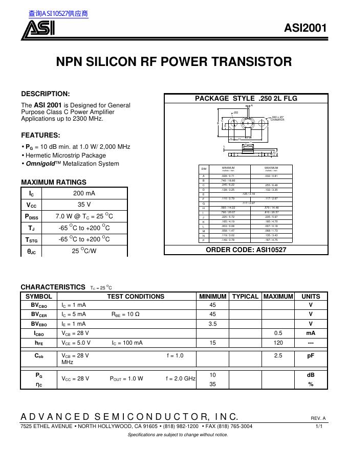 ASI ASI2001 NPN SILICON RF POWER TRANSISTOR 数据手册.pdf