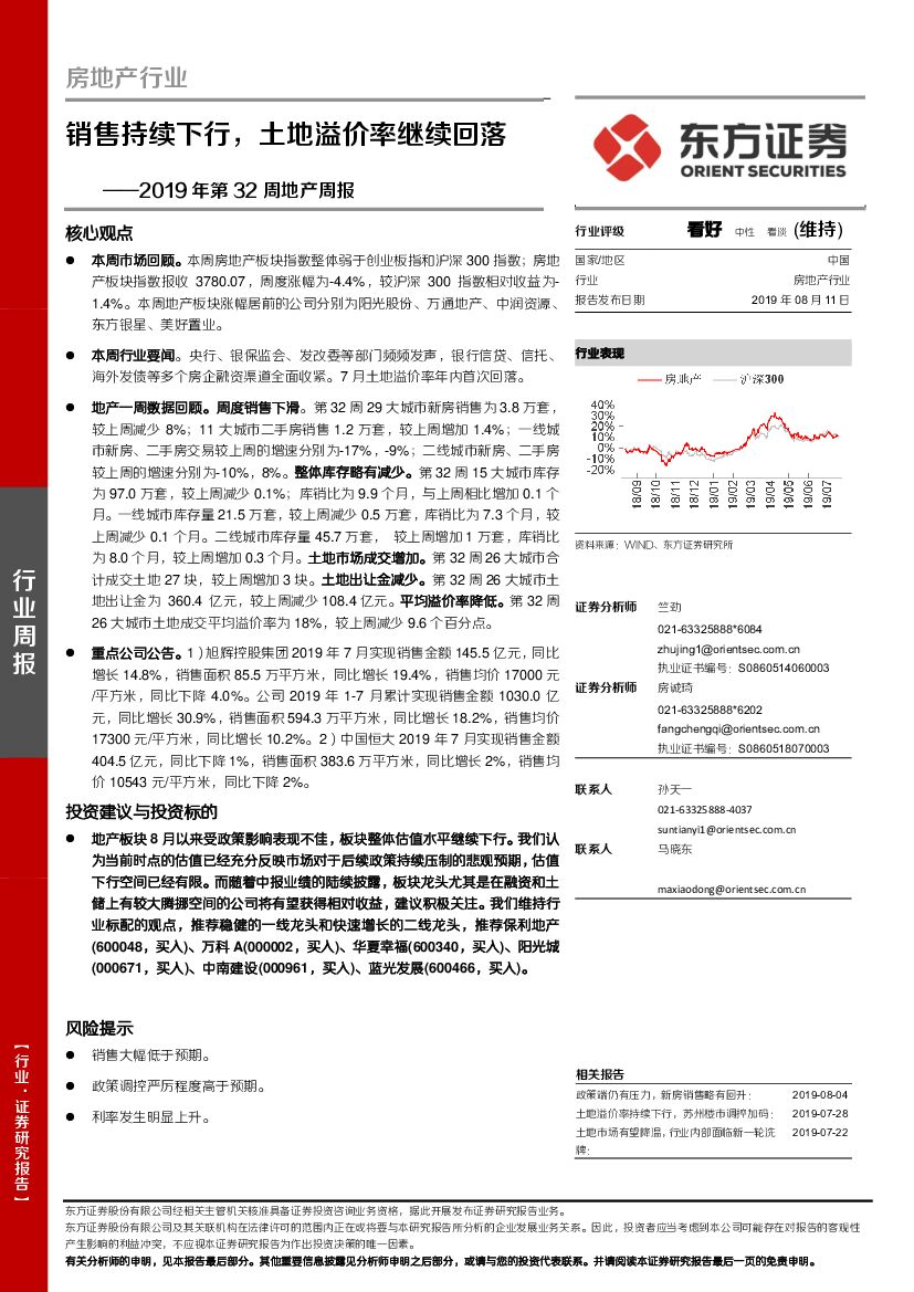 东方证券:2019年第32周地产周报:销售持续下行,土地溢价率继续回落.pdf