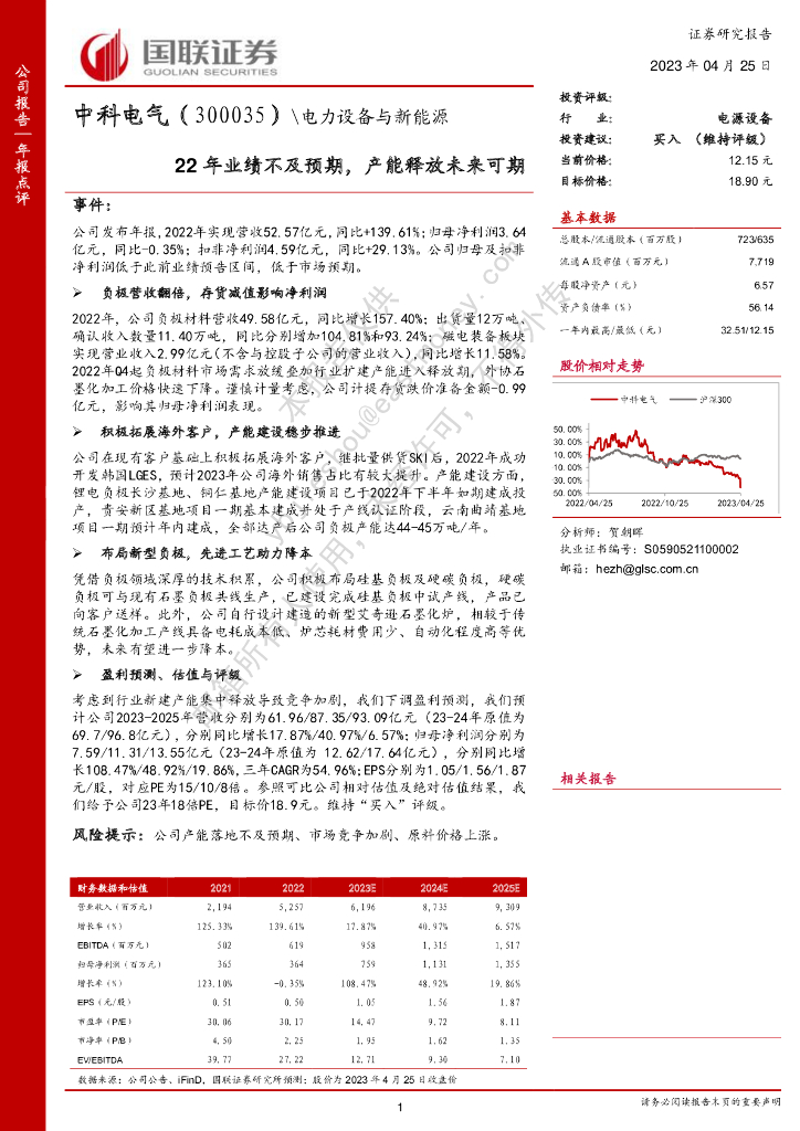 国联证券:中科电气(300035)-22年业绩不及预期,产能释放未来可期.pdf