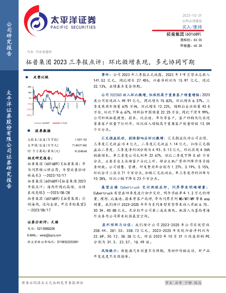 太平洋证券:拓普集团2023三季报点评:环比微增表现,多元协同可期.pdf