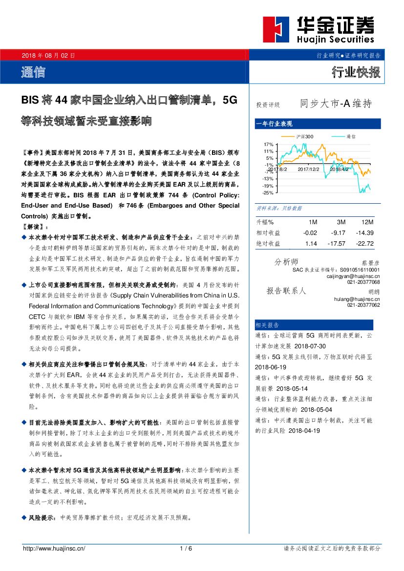 华金证券:通信行业快报:BIS将44家中国企业纳入出口管制清单,5G等科技领域暂未受直接影响.pdf
