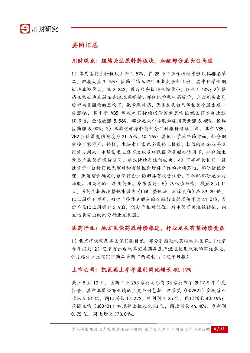 川财证券:医药生物行业周报:继续看好原料药,加配龙头白马股.pdf