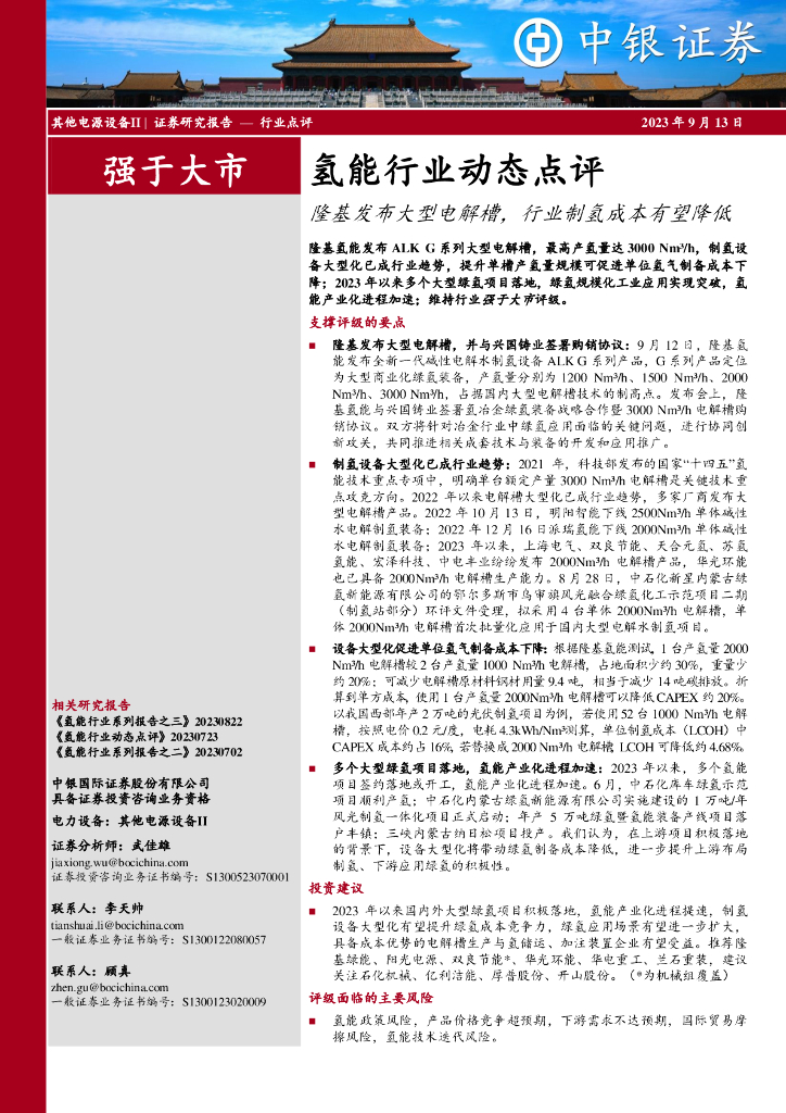 中银证券:氢能行业动态点评:隆基发布大型电解槽,行业制氢成本有望降低.pdf
