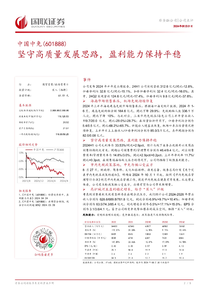 国联证券:中国中免(601888)-坚守高质量发展思路,盈利能力保持平稳.pdf