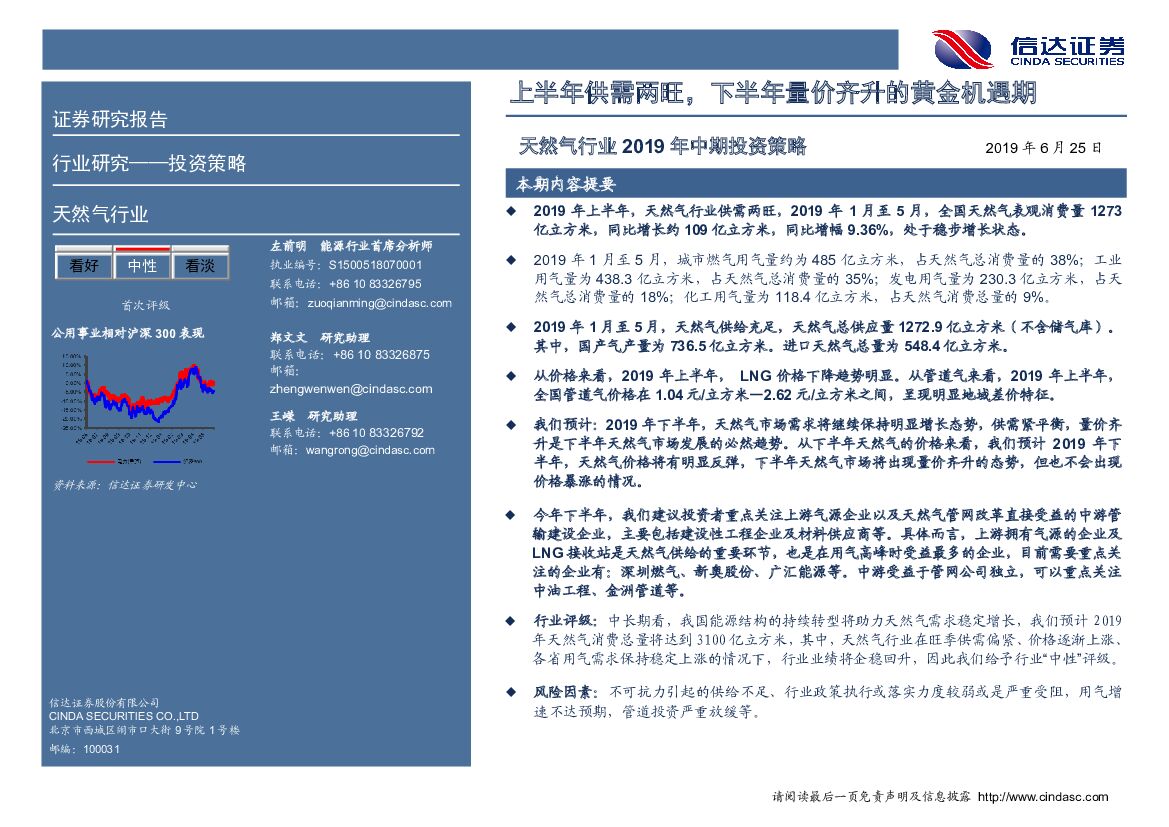 信达证券:天然气行业2019年中期投资策略:上半年供需两旺,下半年量价齐升的黄金机遇期.pdf