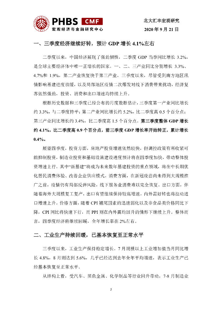 北大汇丰智库:出口增速持续上升,GDP 增长有望超4%——2020年第三季度中国宏观经济分析.pdf