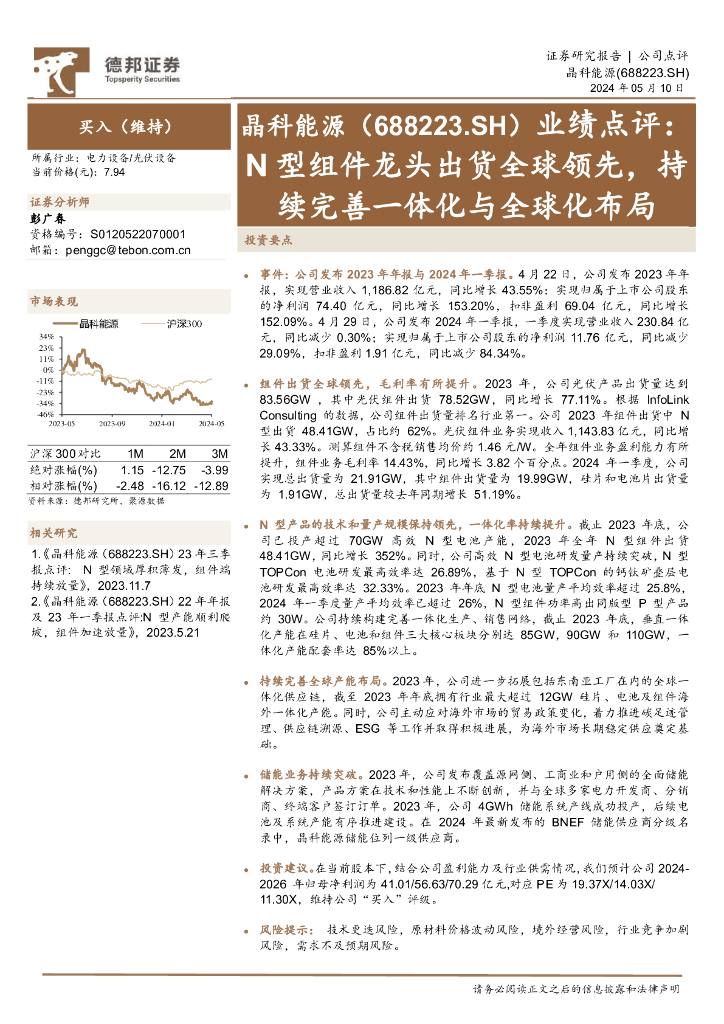 德邦证券:晶科能源(688223)-业绩点评:N型组件龙头出货全球领先,持续完善一体化与全球化布局.pdf